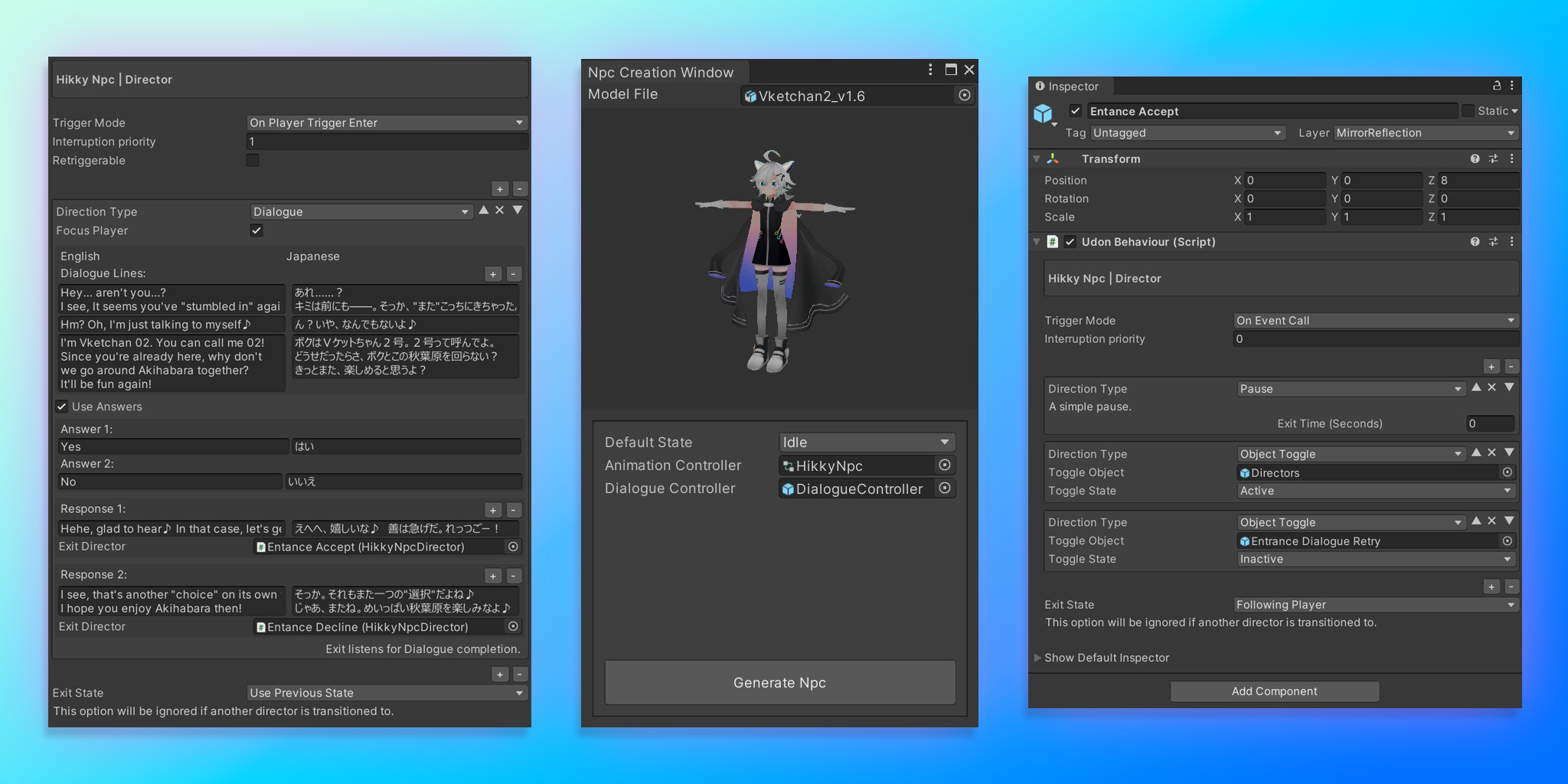 Hikky Co Ltd focuses on sales events in Virtual Reality through their yearly "Virtual Market" or "Vket" events. My main task was designing an interactive NPC character with customizable events, dialogue, and actions depending on which sales booth you were closest to. As much of the team is Japanese, all of my tooling needed to be as expansive and intuitive as possible to let them make content with my tooling. Expanded versions of these tools were written after I finished the Medium article discussing it, where dialogue and other text is imported directly to Unity from Google Sheets csv links.